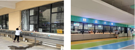 餐饮服务及生活保障门店提前计划、合理安排,组织员工对餐饮器具、环境卫生、设施设备进行全面深度打扫清洁,为暑假留校师生、军训教员提供饮食生活服务保障。