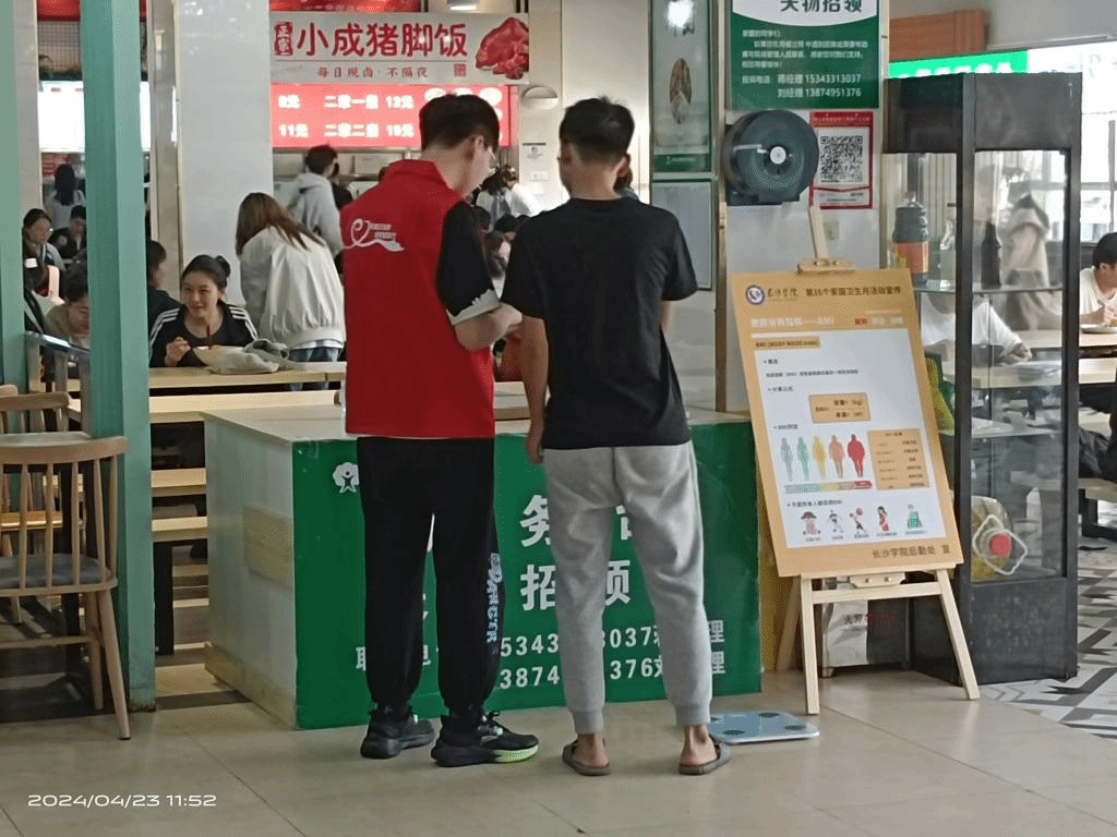 4月23日,“今天你称重了吗”的宣传活动在学校各个食堂门口进行。青春同伴社、校权益部的志愿者分别引导就餐的师生测量体重、监测体脂、指导计算体重指数,并发放宣传折页。饮食服务中心通过在学校各个食堂张贴“体重指数计算公式”桌贴宣传健康体重管理的重要性。