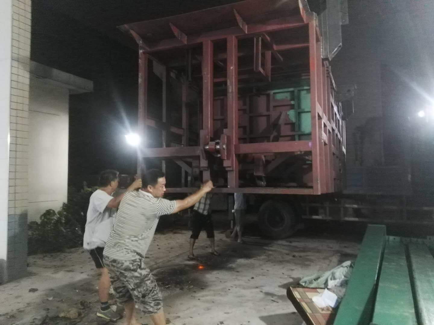 7月31日凌晨一点维修科科长李保钢与水电班班长李集辉、水电工小廖在卸刚运送到的设备