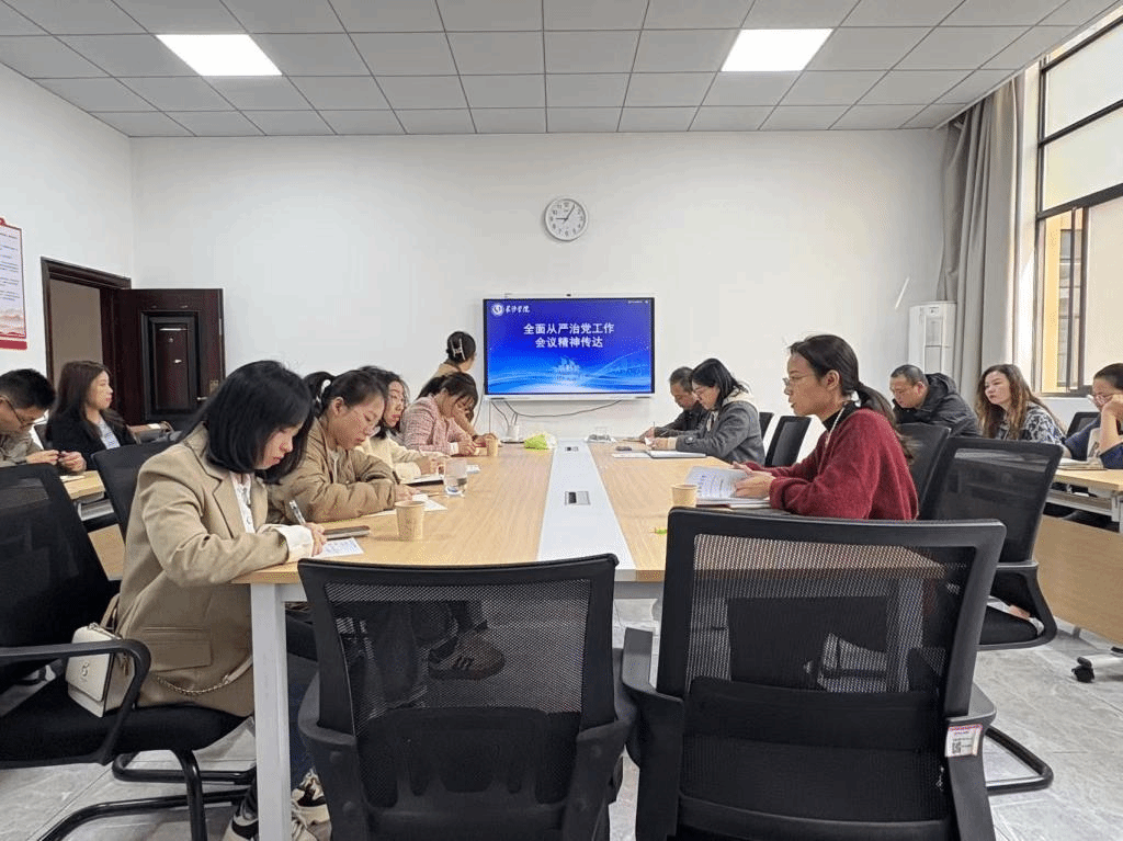 会上,副处长陈樱传达党委委员、纪委书记丁文在全面从严治党工作会议上的报告精神。副处长袁丽君带领学习党委副书记刘寒波在全面从严治党工作会议上的讲话精神。