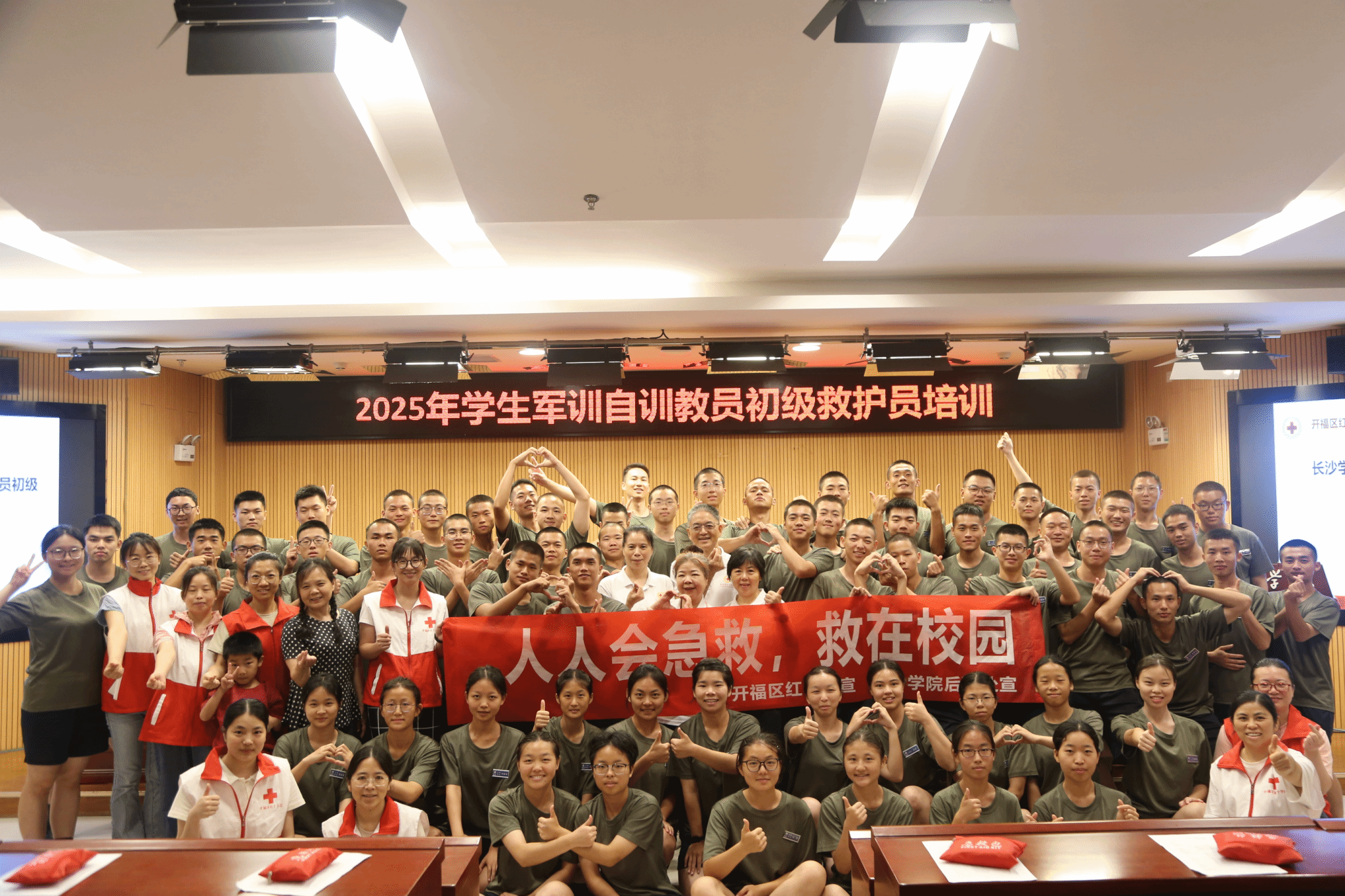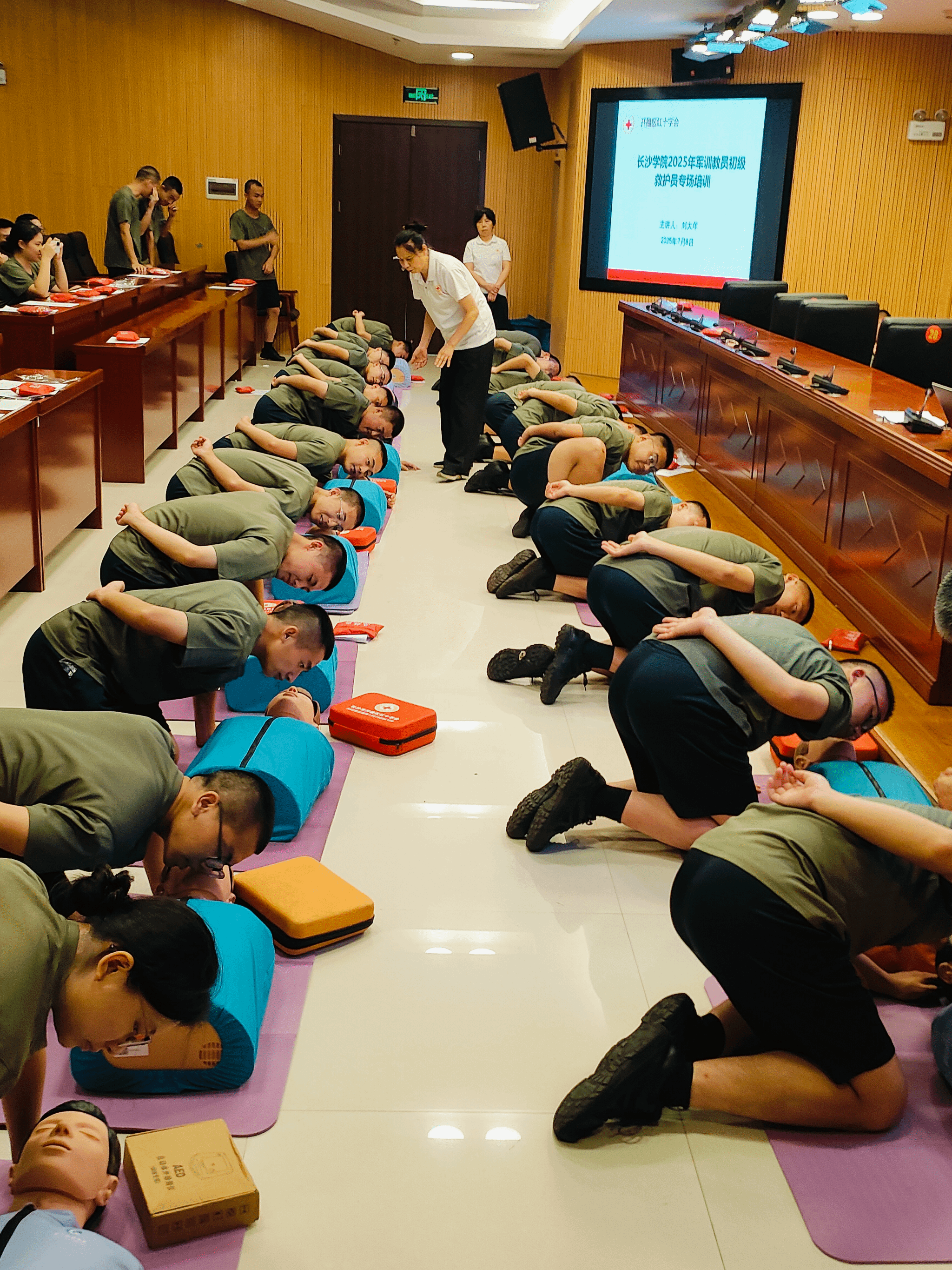 7月9日,长沙学院图书馆一楼学术报告厅内气氛热烈,一场由学校后勤处、保卫处联合开福区红十字会组织的红十字初级救护员培训活动顺利举行。本次培训旨在提升新生军训自训教员及相关学生工作负责老师的应急救护能力。